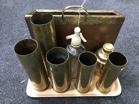 A tray containing an embossed brass magazine rack together with five ammunition shell casings, a brass cocktail shaker and a vintage soda siphon
