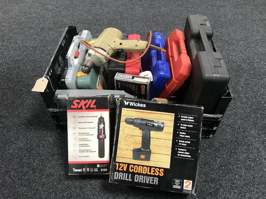 A box containing boxed and unboxed power tools, drill bits, cased drill bits, cased screwdriver set etc