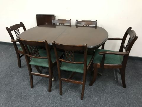 An inlaid mahogany twin pedestal dining table with leaf and six chairs (two carvers plus four singles)