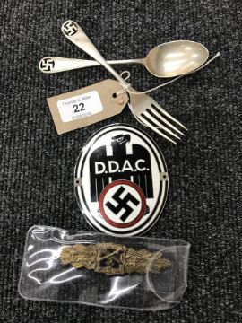 A fork and spoon bearing swastika emblem and two reproduction German badges