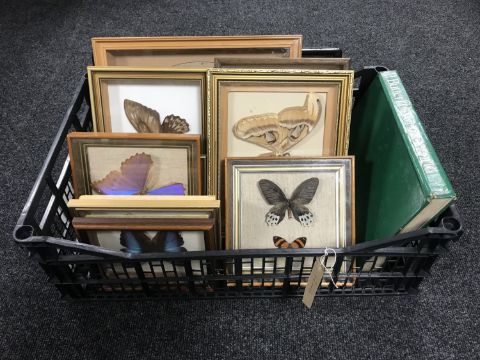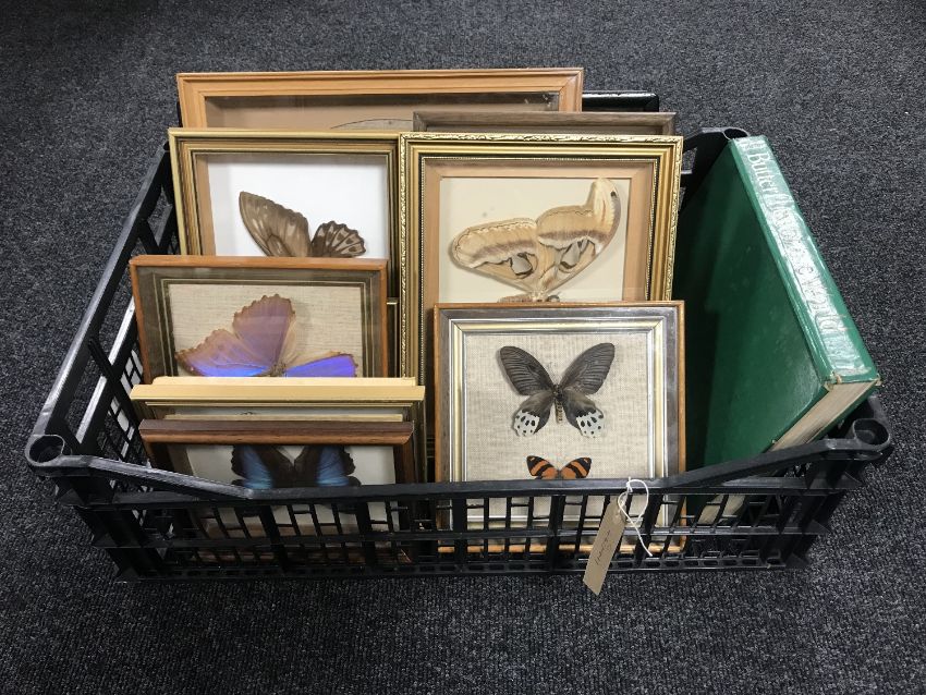 Eleven frames containing butterfly specimens, together with one volume 'Butterflies of the World' by H.L. Lewis