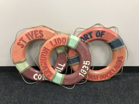 Three wooden life rings, Port of Docklands, St Ives Cornwall, etc