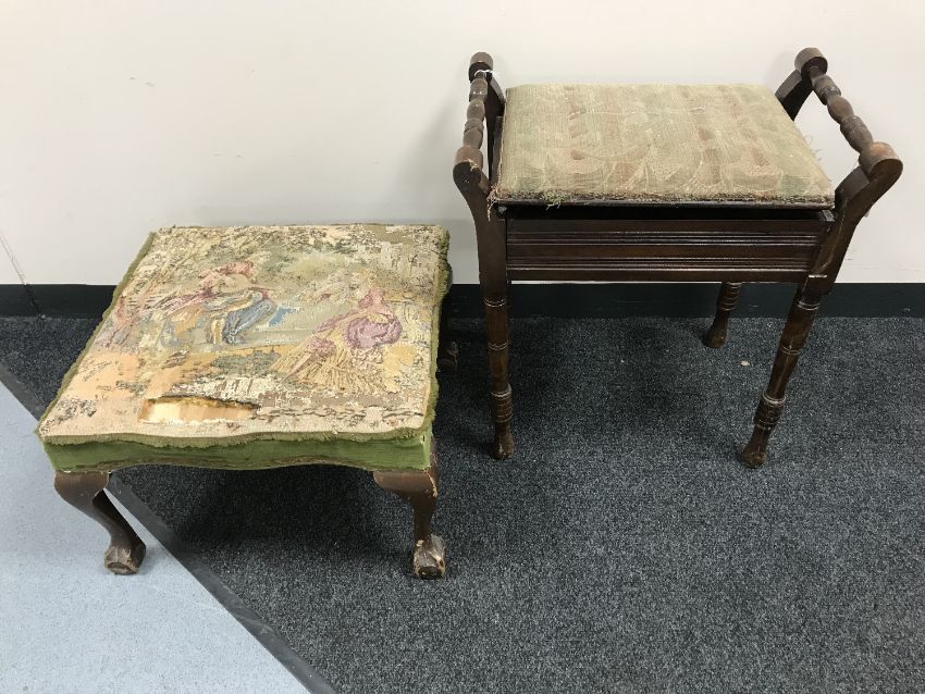 A mahogany storage piano stool together with an early twentieth century tapestry upholstered footstool on claw and ball feet