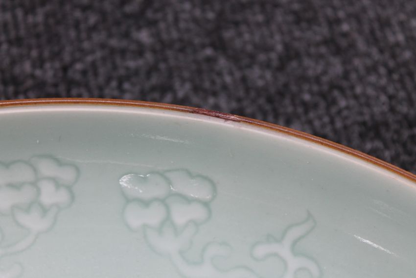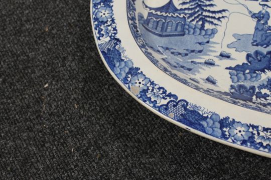Celadon plate with two small areas of restoration to rim. Willow plate with several flaked chips. The celadon plate is 36cm in diameter.