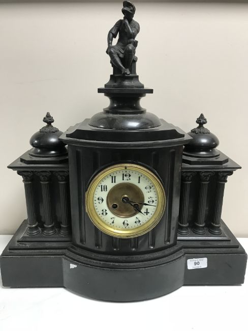 A Victorian slate mantle clock with gilt and enamel dial
