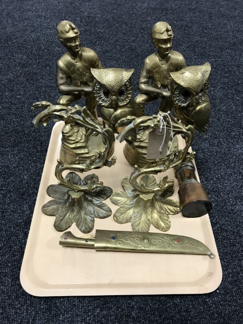 A tray of pair of brass miners figures, pair of brass owls on branches, brass Eastern handled knife in sheath and a copper lantern