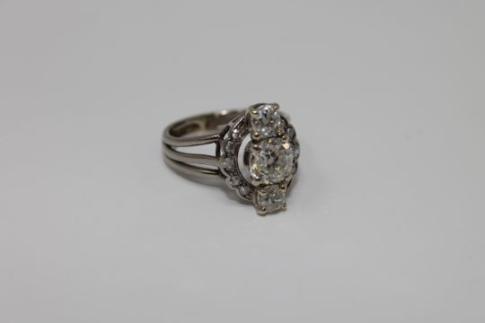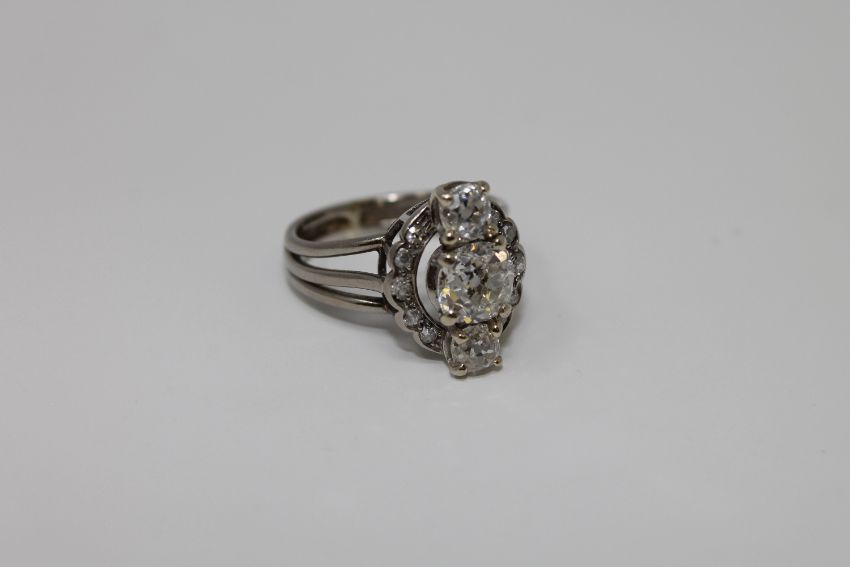 A platinum and diamond ring, the three old cut diamonds in raised claw settings above a diamond border, the principal diamond weighing an estimated 0.6 carat
