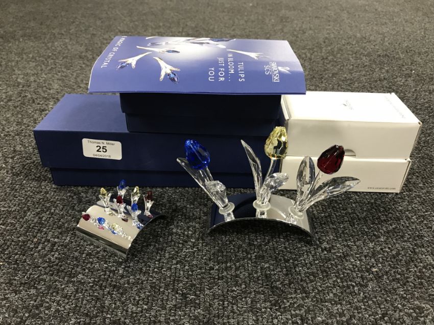Three Swarovski Crystal tulips on stand together with accompanying nine miniature tulips on stand, all parts boxed.
