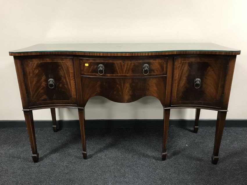 A inlaid mahogany serpentine fronted sideboard with lion mask handles