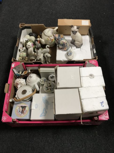 Two boxes containing assorted pill boxes, china figures, collectors plates, etc