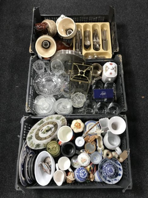 Three boxes containing assorted glassware, light fitting, seventies pottery light fitting, Ringtons china, cutlery, etc