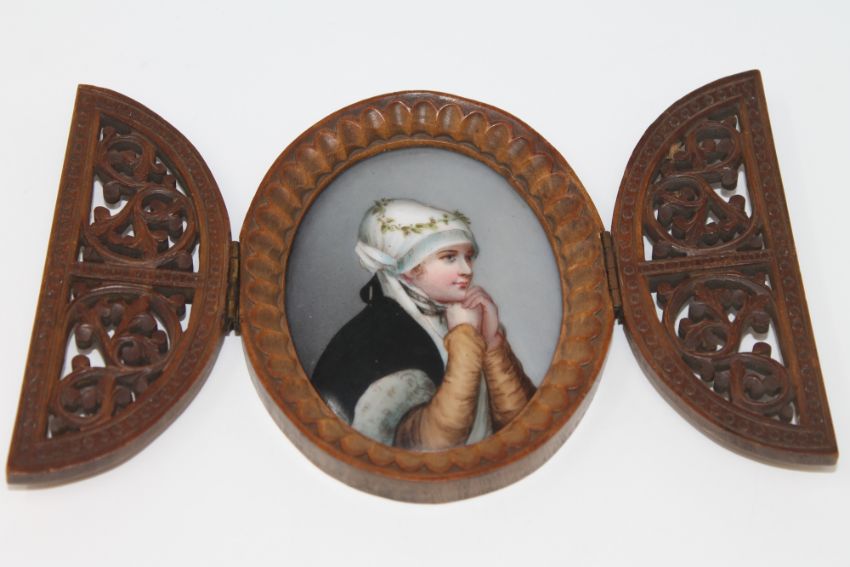 An antique wooden framed painted porcelain plaque depicting a young girl