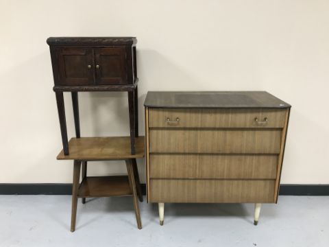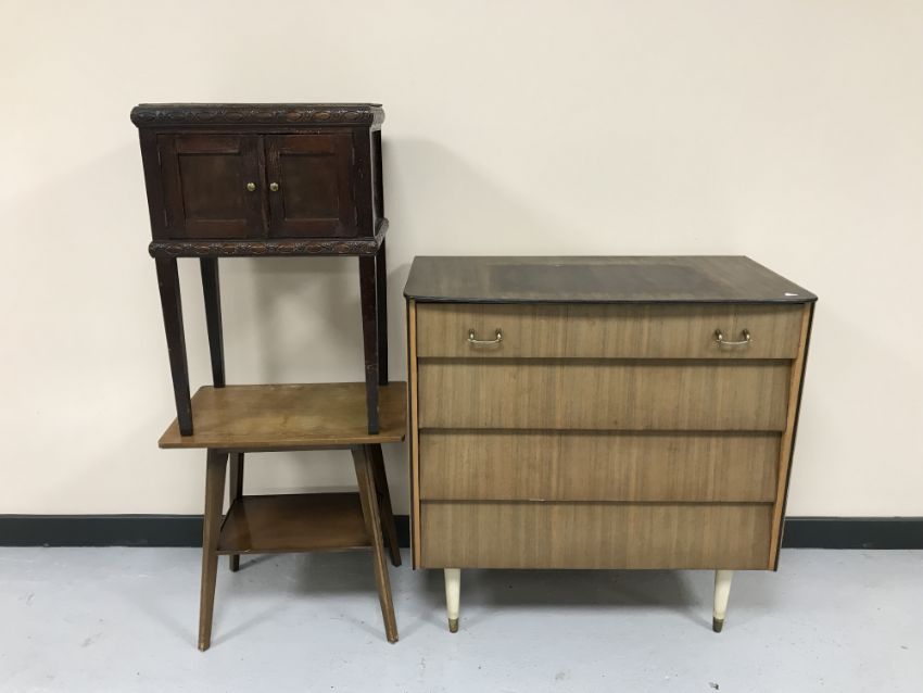 A mid 20th century teak four drawer chest, walnut side table and an oak double door cabinet