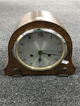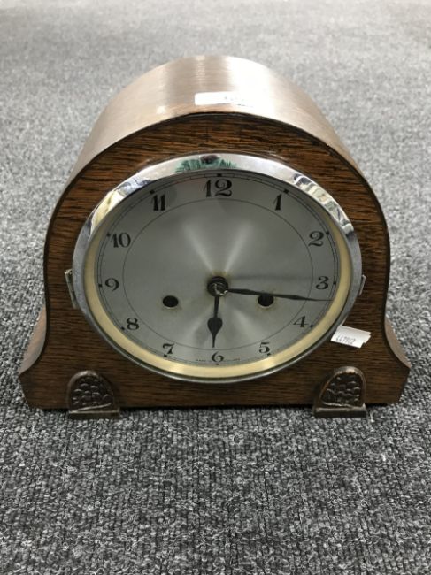 An oak cased mantel clock with silvered dial (with pendulum and key)