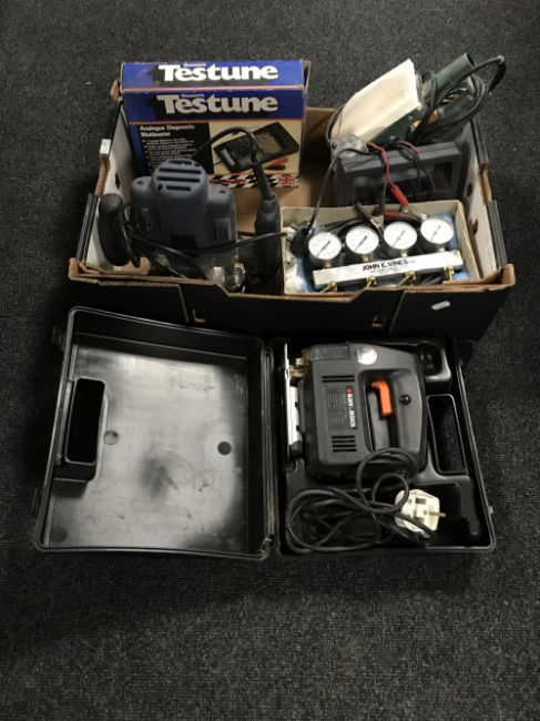 A box containing electric power tools, cased Gunsons testune diagnostic multimeter, etc