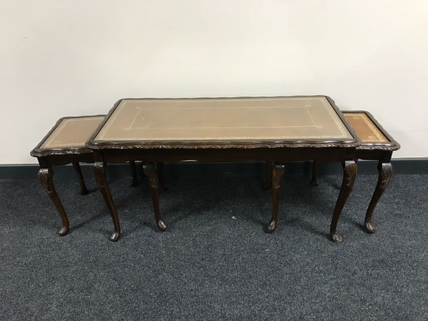 A mahogany glass and leather topped coffee table fitted two tables beneath