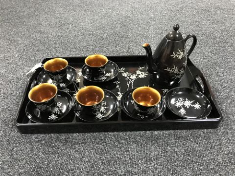 An Oriental lacquered coffee set on tray