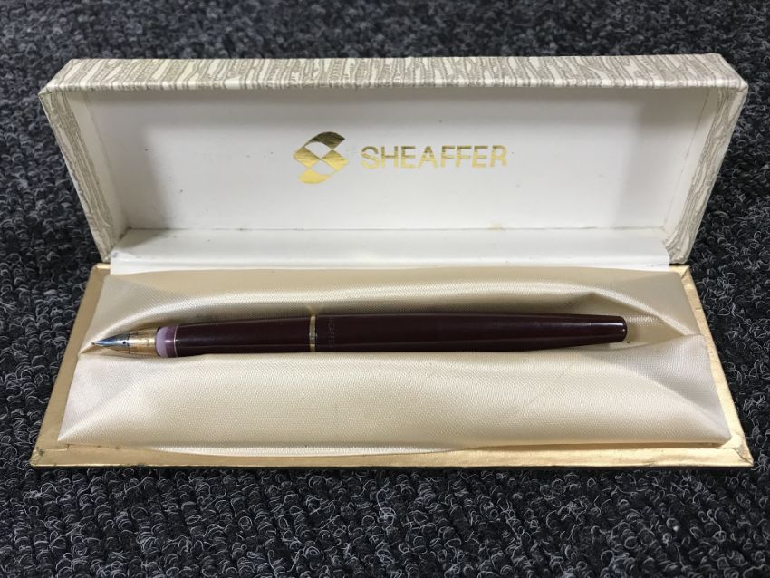 A basket containing assorted drawing instruments, rulers, calculators, together with a boxed Sheaffer pen with a 14ct gold nib