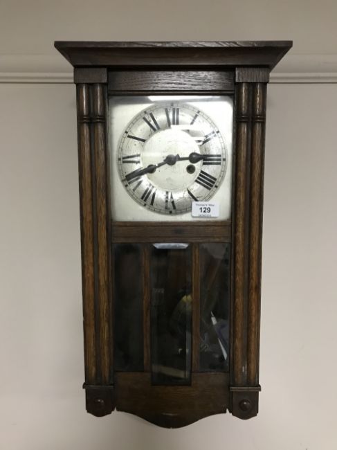A oak cased eight day wall clock with silvered dial