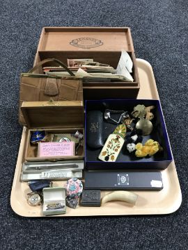 A tray containing a cigar box containing black and white photographs, a national registration identity card, together with a ladies leather bag, trinket boxes, a gold ladies watch face, pens, miniature teddy bear, etc