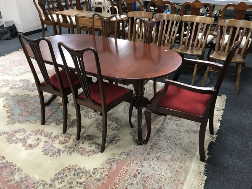 A contemporary inlaid mahogany dining table together with a set of five Queen Anne dining chairs, one carver four singles