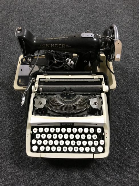 A cased Singer electric sewing machine, together with a cased Zephyr typewriter