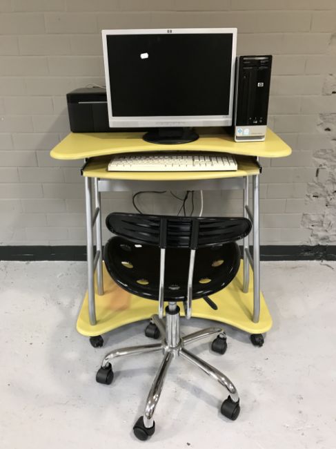 A computer desk with swivel chair, HP Pavilion slim line disk drive, monitor, keyboard and Epson printer