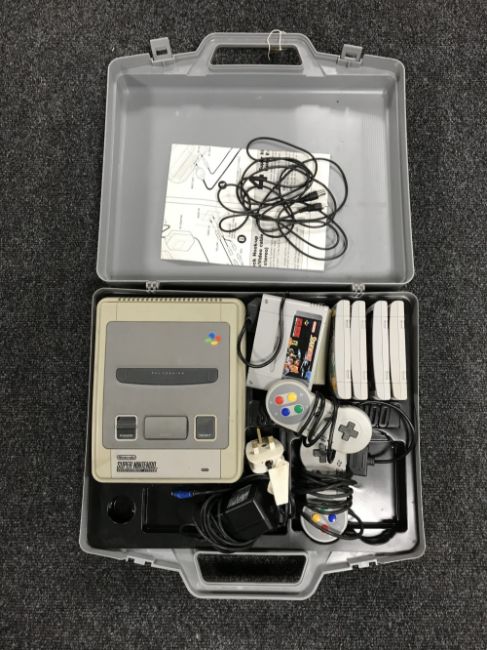 A Super Nintendo Entertainment System with controllers and five games in a carry case