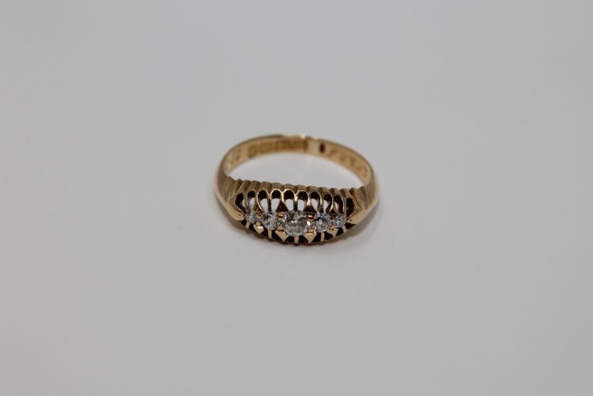 An 18ct gold five stone diamond ring, size J, 2.6g.