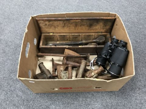 A box containing a pair of Tasco binoculars, vintage flat irons, a small pine box containing chisels, etc