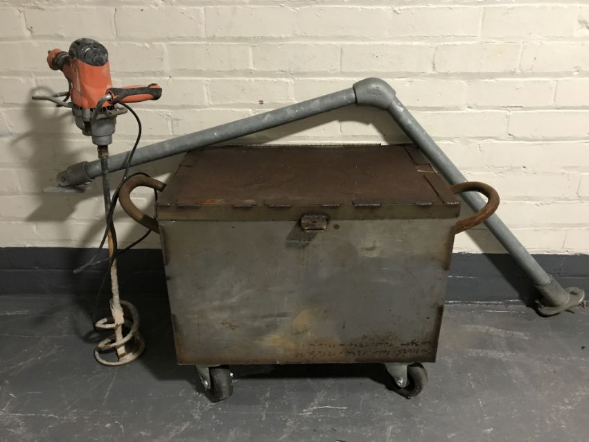 A metal storage chest on wheels, together with a plaster mixer and a metal handrail