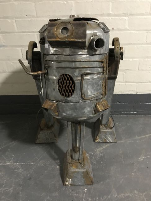 A metal garden burner in the form of R2-D2