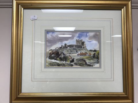 A pair of gilt framed watercolours - boats at low tide, one other by the same artist signed R. J. Tilley, gilt framed print of Bamburgh Castle