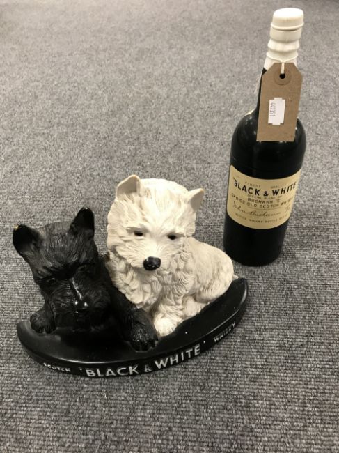 Two mid twentieth century black and white scotch whiskey advertisements, a cigarette holder in the form of a bottle, together with a counter top advertisement