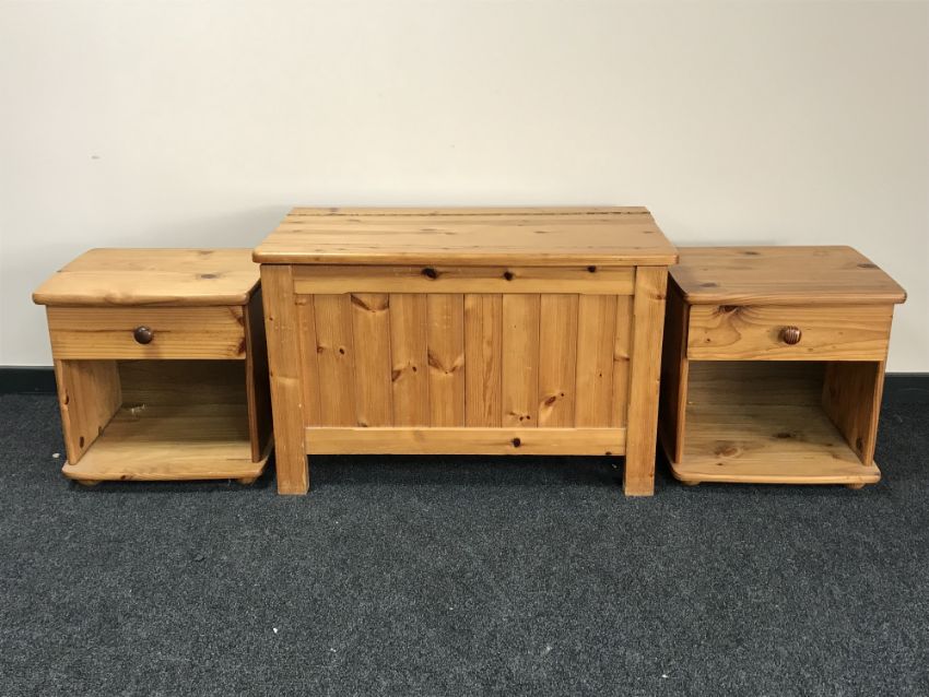 A pine blanket box, together with a pair of pine bedside stands, fitted a drawer