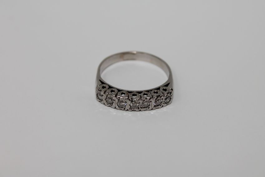 A seven stone diamond ring on white metal shank, size O, 3.9g.
