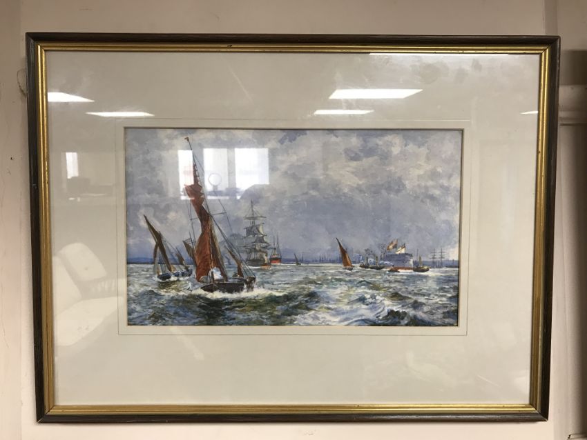 Twentieth century school : boats in choppy water, watercolour, 33 cm x 20 cm, framed.