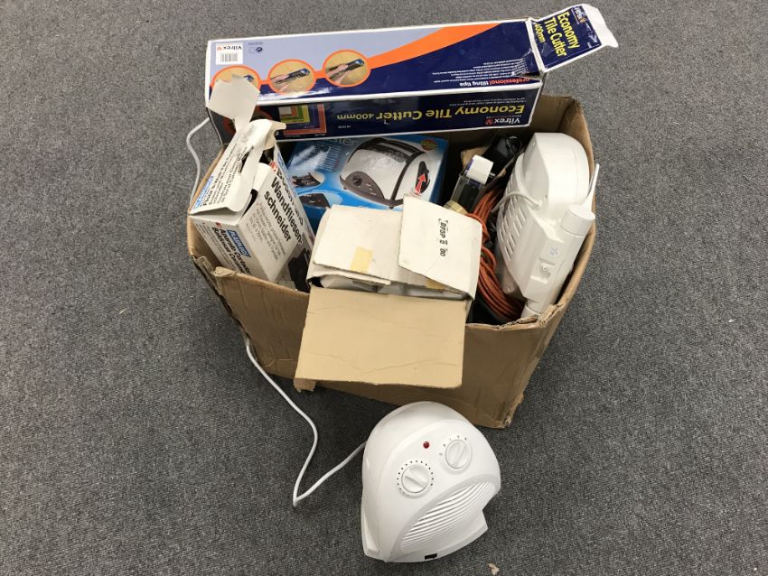 A box of tile cutters, electric heaters, extension lead, toaster etc
