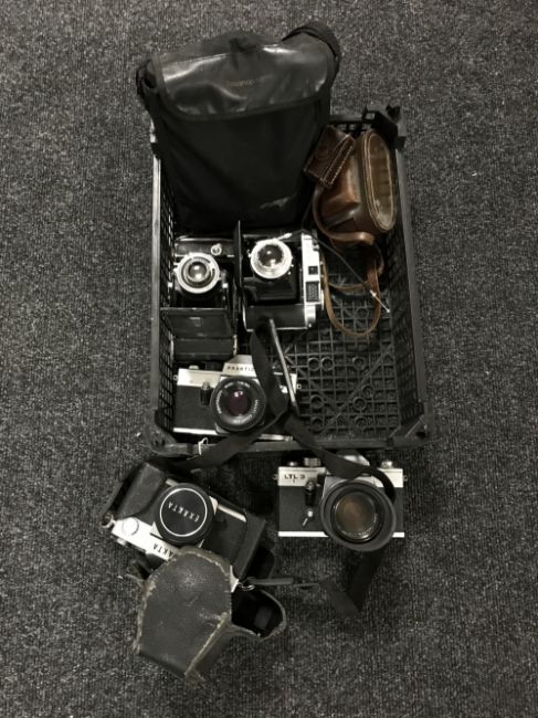 A basket of assorted cameras including Pratika TL3, EXAKTA TL 500 and a set of cased binoculars