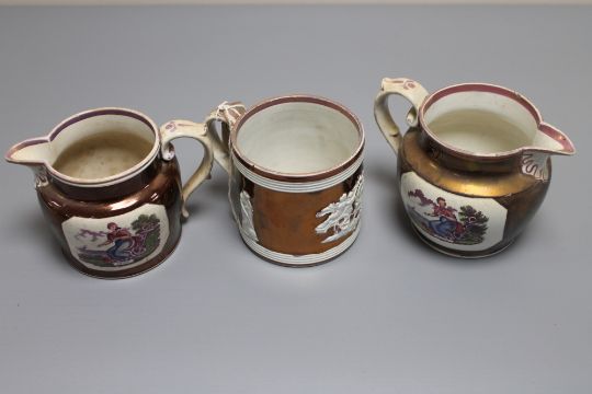Two copper lustre jugs, 'Hope', together with a copper lustre tankard