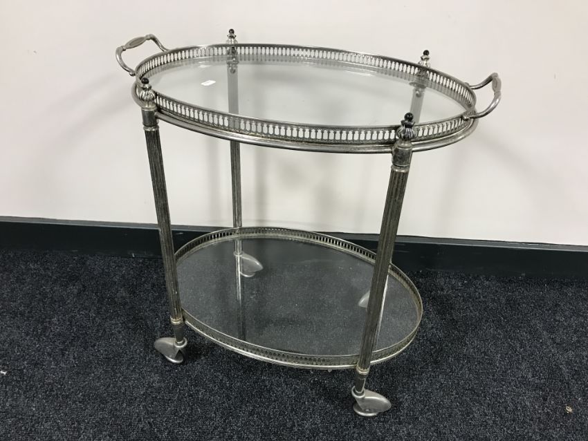 A chrome two tier serving trolley with lift off gallery tray