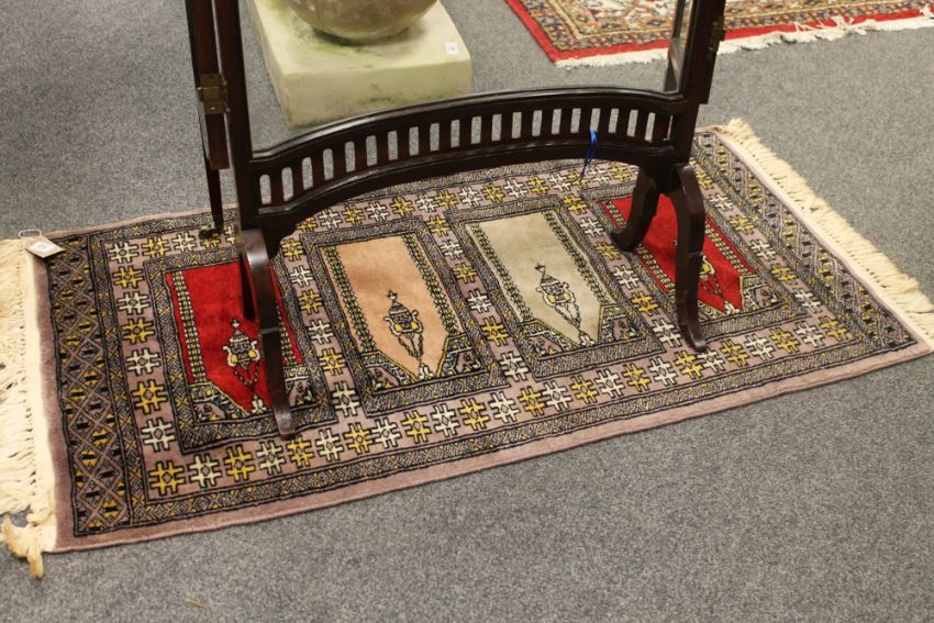 A prayer rug of Anatolian Keyseri Saph design, the central field with four mihrabs on a mauve ground,, 64cm x 122cm