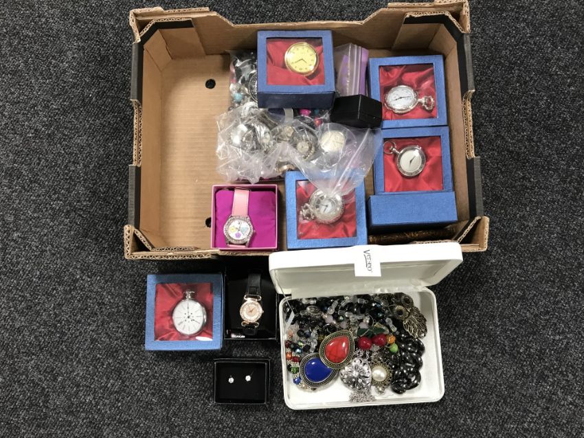 A box of contemporary pocket watches, wrist watches, costume jewellery etc