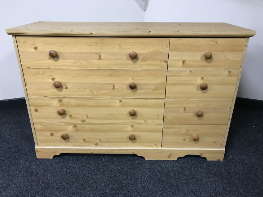An eight drawer pine effect chest and a pine 4'6 headboard