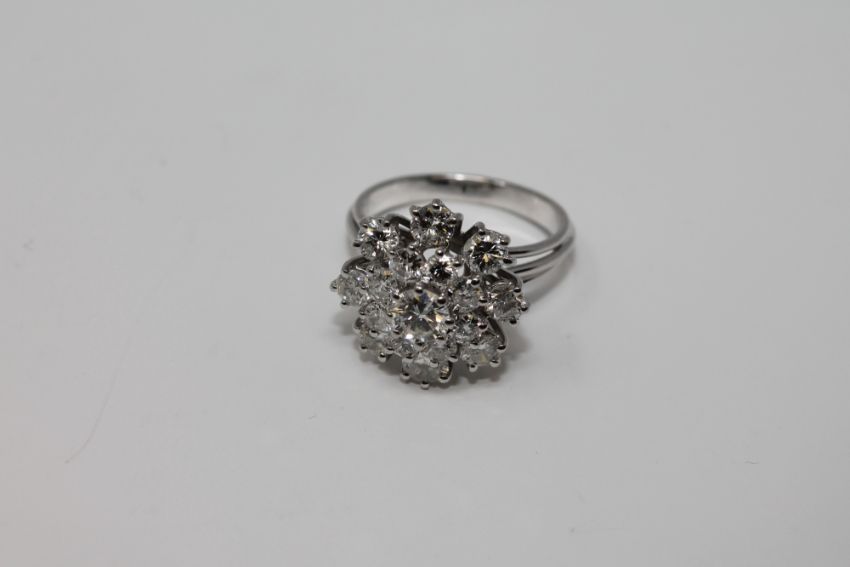 The ring is in good condition. It weighs 5.5g. It is set with 17 brilliant cut diamonds which each differ very slightly in colour or clarity. Most of the diamonds are of very good clarity; approximately VVS2/VS1. A couple have some very minor black inclusions when viewed under magnification and I would rate them at approximately SI1 clarity. All of the diamonds are quite radiant and present well to the naked eye. The diamonds are all approximately H/I/J in colour.