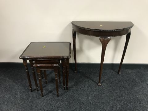 A nest of three inlaid mahogany glass topped tables, together with and inlaid mahogany D shaped hall table