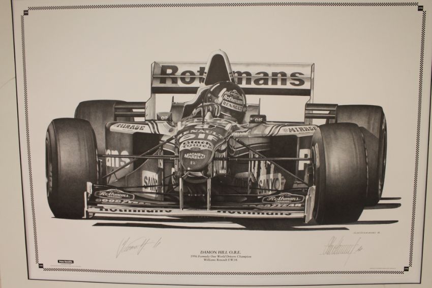 After Alan Stammers : Damon Hill O.B.E. 1996 Formula One World Drivers Champion - Williams Renault F.W.18 monochrome reproduction, an artist's proof, signed both by the artist and by Damon Hill, published by Peter Ratcliffe as part of the "Legends in Time" series, 1996, 56 cm x 82 cm, unframed.