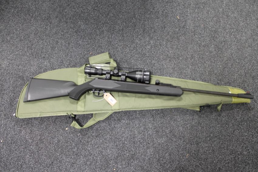 An SMK Sports Marketing SYNSG .177 air rifle together with a Hawke scope, in Sabre carry bag with tin of pellets
