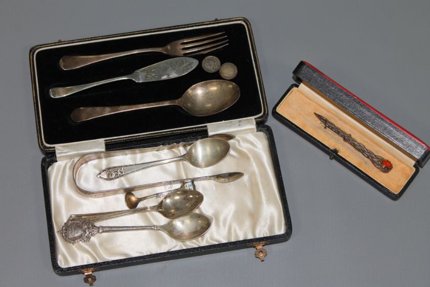 A collection of sterling silver, including a Celtic brooch, a cased baby fork and spoon, together with a set of sugar tongs, three teaspoons, a mustard spoon, and two Georgian three pence pieces