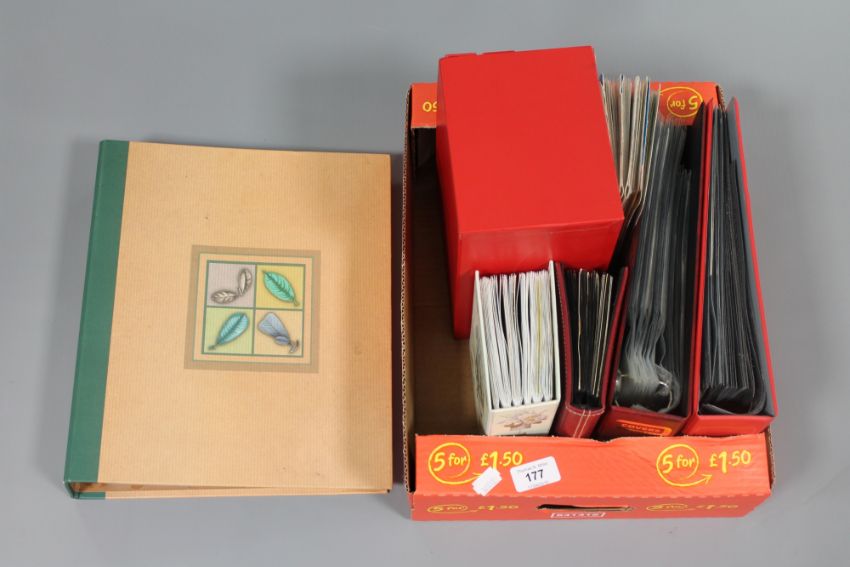 A box containing two albums of first day covers, together with a quantity of assorted postcards in albums